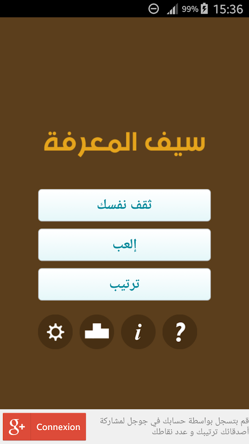 سيف المعرفة هي لعبة مثيرة تقوم على أساس اختبار معارفك في الثقافة العامة لعبة شيقة وممتعة تتحدى ذكاءك ومعرفتك بمختلف الأسئلة العامة سوف تدور أحدات المعركة بينك و بين عدة اسئلة منها الصعبة و السهلة و سيكون عليك الحفاظ على المال الذي ستجمعه عند كل سؤال صحيح وتضاعف المال لكي تحصل على مراتب عالية تنافس بها اصدقائك .